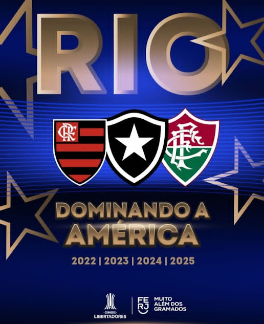 De 2022 a 2025, o futebol carioca vem mandando no continente americano. São quatro temporadas em que a bola sorriu para o talento carioca com os títulos de Botafogo, Flamengo e Fluminense. O Rio continua lindo!