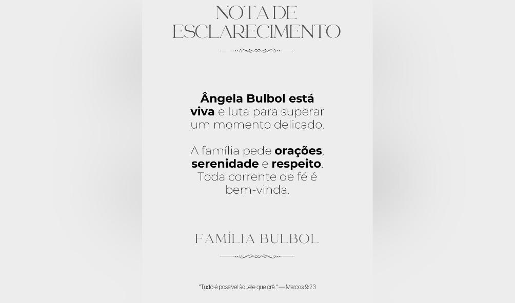 Após a circulação de informações preliminares sobre uma suposta morte cerebral, a família divulgou nota esclarecendo que Angela Bulbol está viva e enfrenta um momento delicado, lutando pela recuperação.